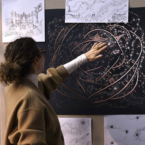 This holiday season in collaboration with Safia Ouares we wanted to convey the magic of light, all its brilliance, all its stars. The starting point for this illustration is the Lancôme rose, “its petals inspired me to go on a journey though the mesmerizing city of Paris. It creates a kind of spiral, and we arrive to the heart of the magical Petit Palais.